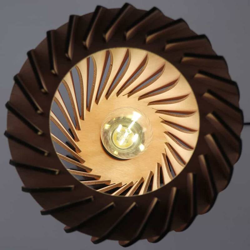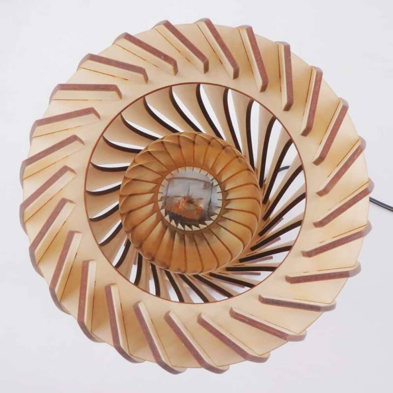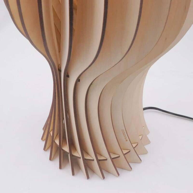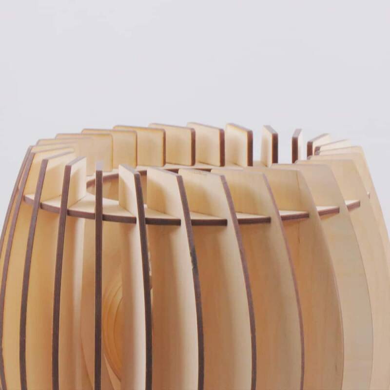 De slanke lijnen en open structuur zorgen voor een zachte lichtval en een warme ambiance. De combinatie van vorm en materiaal geeft de lamp een rustige, maar opvallende aanwezigheid in het interieur.